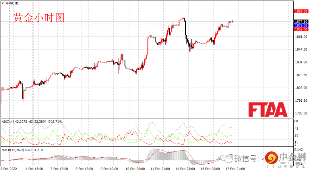 黄金期货周三上涨,最低1851.50,最高1874.40,日图收出下影中阳线,显示短期多头发力,当前反弹已经将前日的跌幅大部收复,日图级别或延续震荡偏多。周四凌晨的美联储会议纪要没有更鹰派的表示,较预期温和,靴子落地,金价压力解除,昨日黄金亚欧盘震荡后,美盘时段持续反弹。当前ADX指标高位,MACD指标翻红,短线或延续偏多。今早亚盘消息面出现乌克兰重武器袭击乌东地区,金价短线拉升,操作上可现价附近,或逢低在1873附近轻仓多,止损1869,目标1888。