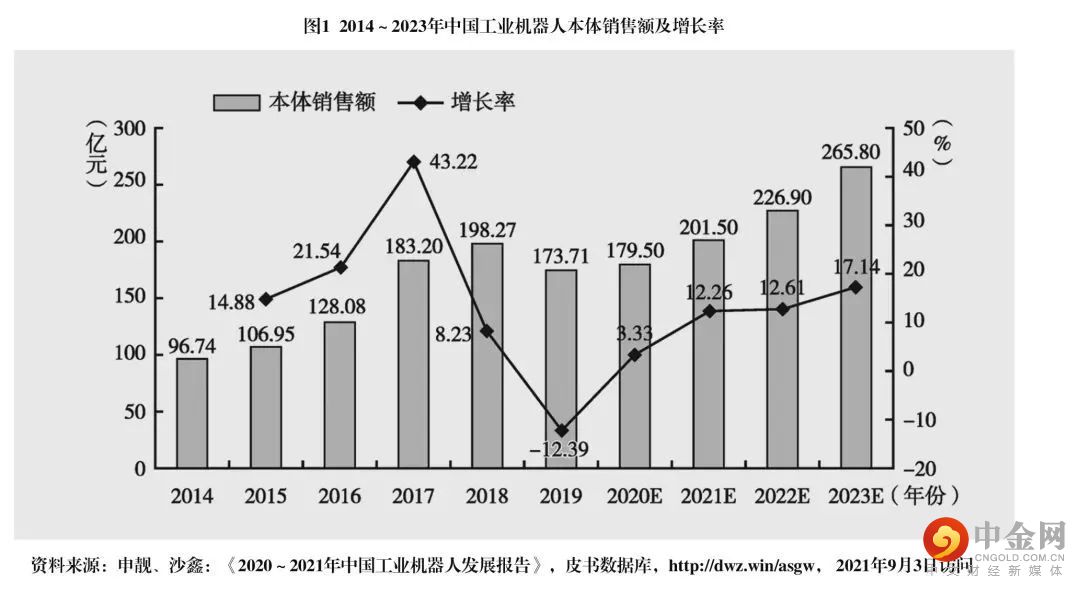 需求方面,国家政策的支持和智能制造加速升级,使工业机器人市场规模持续迅速增长。根据2019年8月中国电子学会发布的《中国机器人产业发展报告2019》,我国生产制造智能化改造升级的需求日益凸显,工业机器人需求依然旺盛,我国工业机器人市场保持向好发展,约占全球市场份额三分之一,是全球第一大工业机器人应用市场。另外,根据国际机器人联盟(IFR)统计,我国工业机器人密度在2017年达到97台/万人,超过全球平均水平,并将在2021年突破130台/万人,达到发达国家平均水平。如图1所示,从长期来看,制造企业对工业机器人仍有巨大需求,机器人价格下行的态势也将延续。在“量增价降”综合因素作用下,工业机器人本体销售额平稳增长,预计到2023年将达265.8亿元。此外,随着部分西方国家对华扼制战略的推进,我国工业机器人在快速发展的同时,也在加快工业机器人伺服电机、减速器、控制器等关键部件的国产替代。工业机器人核心部件国产化,也将成为未来发展的重要趋势。