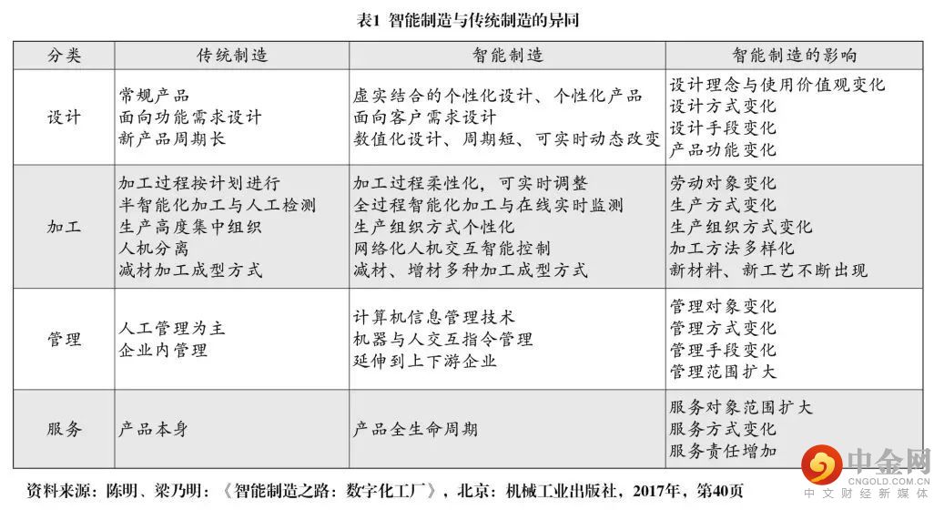 通过表1可以看出,智能制造与传统制造有明显区别。这些区别主要体现在四个方面。一是制造设计更突出客户需求导向,在技术手段上可以做到虚拟与现实相结合,可实现需求与设计的实时动态交互,设计周期更短。二是加工过程柔性化、智能化,生产组织方式更加个性化,检测过程在线化、实时化,人机交互网络化,加工成型方式多样化。三是制造管理更加依赖信息系统,例如更多借助计算机信息管理技术,更多人机交互的指令管理模式,涵盖上下游企业甚至整个产业链的数据交互和管理沟通等。四是智能制造的产品服务可以做到涵盖整个产品生产周期,真正实现产品从制造到终结的全闭环管理,能够极大提高产品适应市场的能力,更充分满足客户的个性化需求。