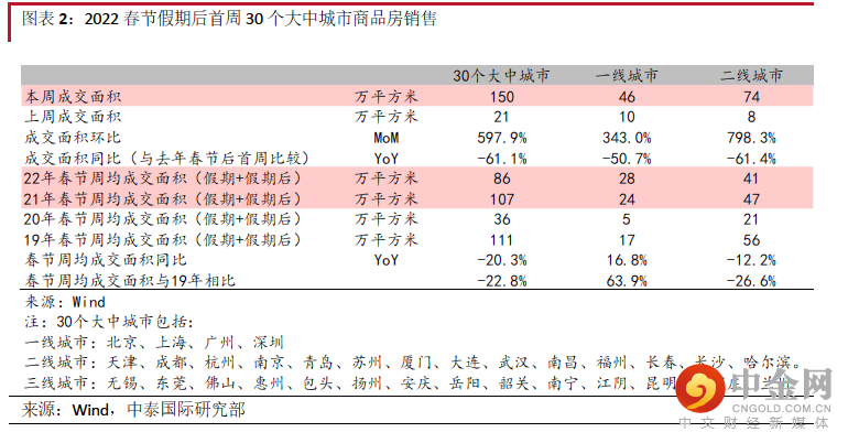 据 Wind 房管局数据,2 月 7 日-13 日 30 个主要城市销售面积较春节假期环比上升 598%至150 万平方米,较 2021 年春节后首周同比下降 61.1%;其中一线城市/二线城市/三线城市销售面积环比上升 343%/798%/970%至 46 万/74 万/30 万平方米,同比分别下降 51%/61%/70%。2022 年春节+假期后首周 30 个主要城市的周均成交面积为 86 万平方米, 同比下跌 20.3%,其中一线城市/二线城市/三线城市的周均成交面积分别同比+16.8%/-12%/-55%。整体来看,销售情况较 21 年及 19 年同期仍走弱,此外城市间进一步分化,低能级城市规模收缩较为显著。