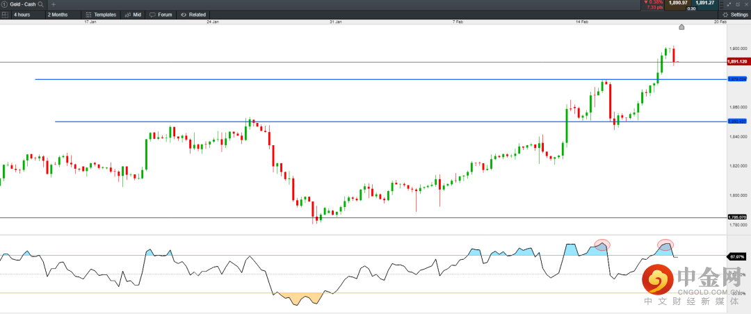 昨日,俄乌冲突再度升级,避险情绪急剧上升,黄金一路高歌猛进,自日低1867.87美元/盎司一路上涨。在美盘时段,俄罗斯在其向美国提交的安全回应中发称,俄罗斯表示没有入侵乌克兰的计划。黄金短线回落至1890美元/盎司下方,但随后拜登宣称俄罗斯入侵的威胁非常大,各种迹象表明俄罗斯军队准备进入乌克兰。现货黄金最终触及1900美元/盎司,这是自去年6月11日以来首次。