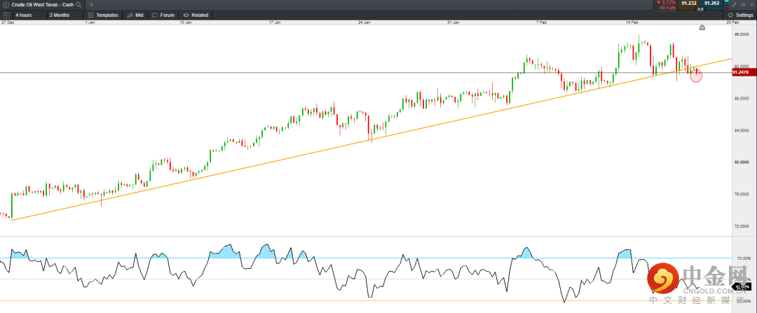 而从4小时级别来看,油价的趋势目前已经跌至自12月底以来形成的上行趋势线下方,RSI指标也进入到了50下方的空头区域,因此短期的回落迹象较大。投资者需要关注90-91的支撑情况,如若失守,价格或将进一步下挫。