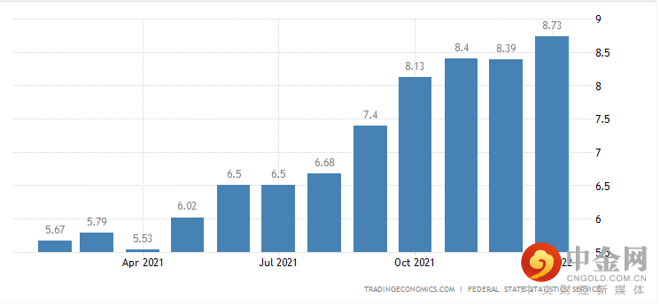 并且在通胀方面,俄罗斯的通胀自去年年中急剧攀升,目前已达到8.73%,远超于央行设定的4%的目标。