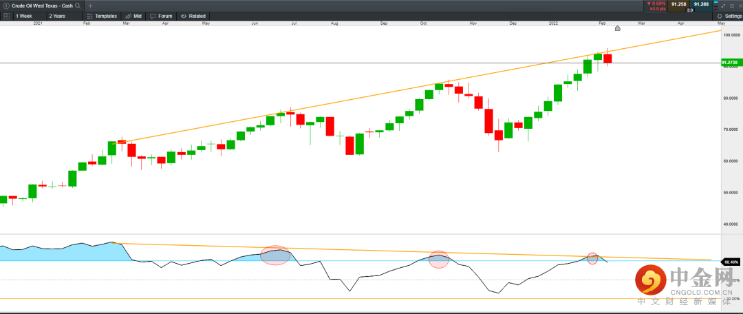 原油自12月底以来已经录得8周连涨趋势,但这一趋势并未在地缘政治冲突升级的本周迎来延续。美国WTI原油在2月14日触及高点96后迅速回落,在随后的两个交易日最低触及90关口。