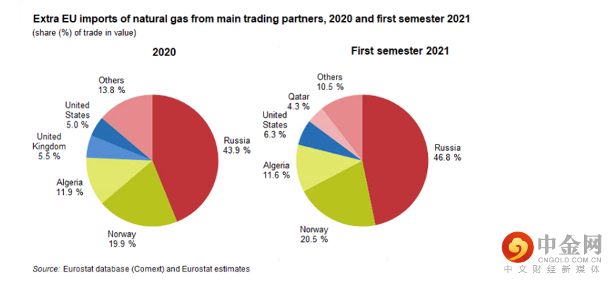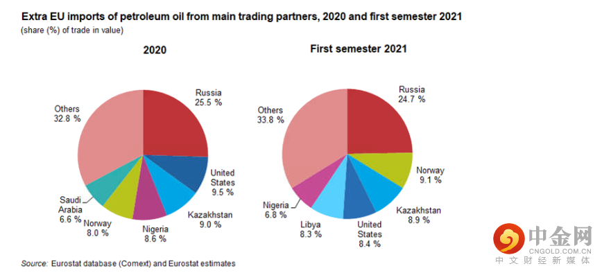 欧洲的能源供给严重依赖俄罗斯,从下图来看,欧洲进口的天然气和石油分别有近50%和25%来源于俄罗斯。