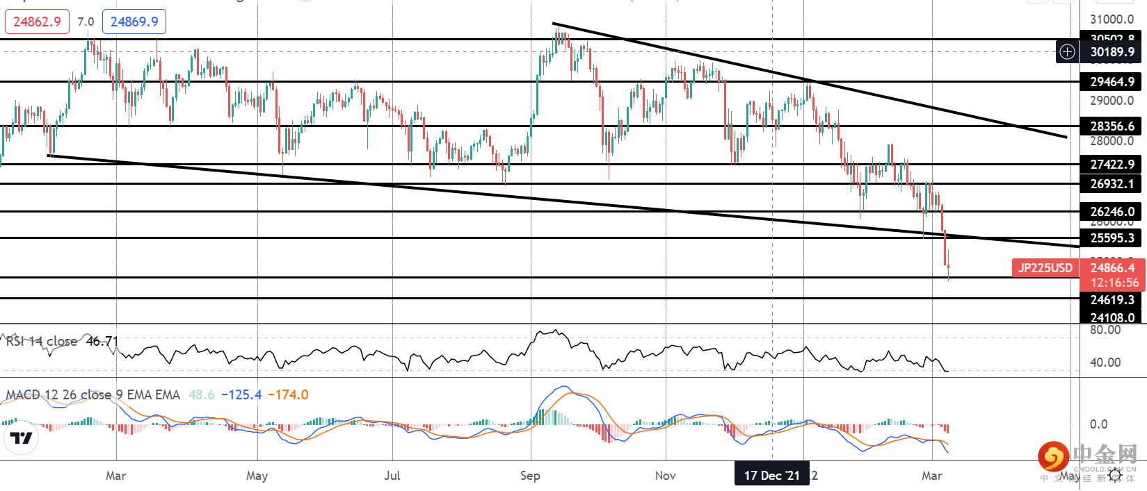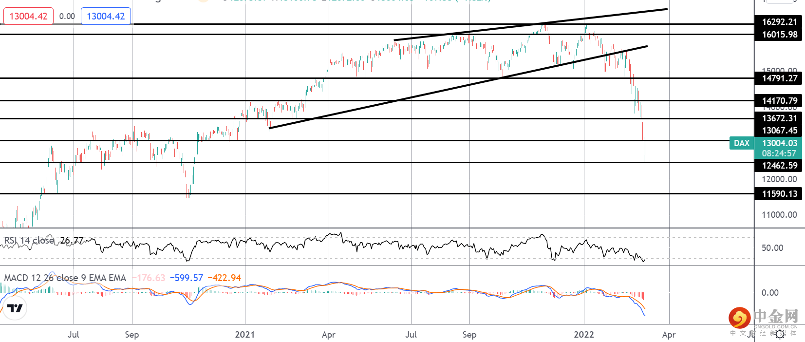DAX 下跌近 30% 的严重程度在这里非常清楚。目前,跌势已在测试 12462.59 水平获得支撑。然而,由于 MACD 和 RSI 均转为坚定看跌,且下行风险明显,市场仍容易进一步下跌至 11590.13 水平。