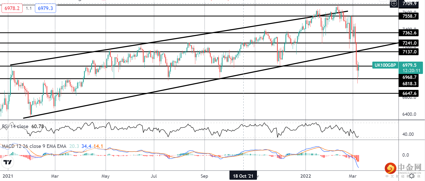 FTSE 的抛售使价格突破了近几个月来构成价格走势的牛市通道。 价格目前维持在 6818.3 水平,并努力回升至 6968.7 以上。 随着 MACD 和 RSI 均转低,有进一步下跌至 6647.6 的风险。 在上行方面,要监控的关键区域将是重新测试 7137 水平附近的破碎通道。