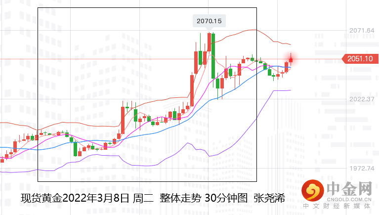 上交易日周二(3月8日):国际黄金伦敦金强劲反弹冲高,临近历史高点,触及2020年8月11日以来新高,终有所回跌收阳。