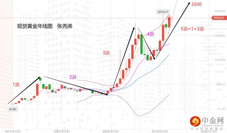 长期看,还是之前观点:年线级别;从1970年的35美元/盎司起为1浪起点的话,目前正处于5浪的攀升阶段,并在空间和幅度上,还仍有很大的空间,一般情况下,3浪当是1浪的1倍或1.618倍(1921美元)。再从1046起到目前为第5浪,根据第5浪与1浪3浪延伸相当原则,高点则会在1046的基础上:加上815美元以及1665美元,为3526美元。