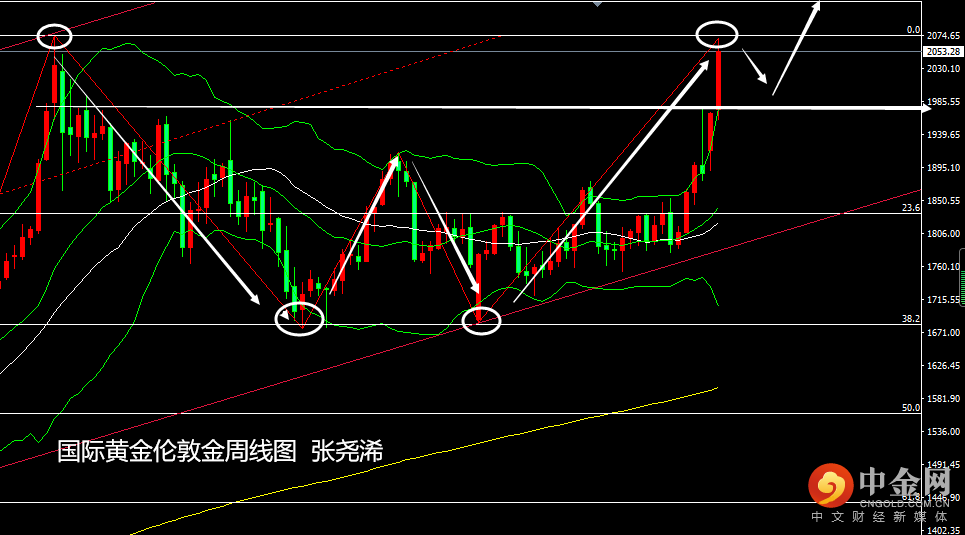 周线级别:金价本周强势向上运行在上轨之外,形态上,以及对比2075美元高点的周K线看,也有一定的回落风险,如果历史重现,那么下周以及其后市将会回跌至1900美元一线,不过金价自2075美元遇阻回落则是美国宽松政策停止和疫苗的问世,目前需要回落,则需要俄乌局势的明显缓解和美国加息力度的增强,但此概率较小,故此金价仍偏向突破历史高点并进一步走强。