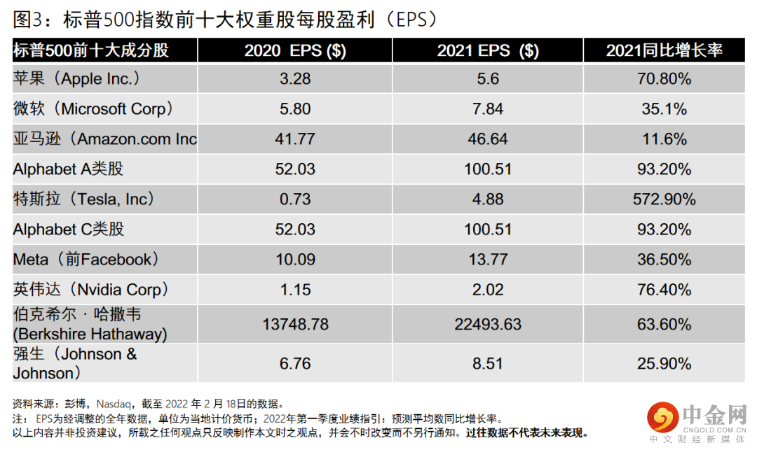 标普500前十大成分股中,科技巨头占据“半壁江山”。从目前公布的每股盈利来看,整体增速和2020年相比都有较突出表现。其中盈利增速最快的是特斯拉,录得572.9%的增速,单车成本不断下降,规模效应带动盈利能力持续提升,自由现金流充足;其次是谷歌母公司Alphabet,录得93.2%的盈利增长率,创下2004年上市以来第四高的年度利润,归功于强劲的在线搜索、视频和互联网广告和企业云服务的强劲增长;芯片巨头英伟达录得76.4%的同比盈利增长,销售额创下纪录,利润较上年同期增加一倍,这主要是受云计算和超大规模客户对其数据中心产品的强劲需求推动;虽然面对芯片短缺浪潮,苹果在2021年的利润率和销售额强势增长,部分收益于疫情以来对于便携式设备的需求暴增,同时也受益于苹果不断的科技创新。