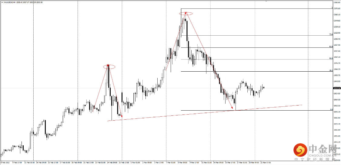 本周一黄金开盘上涨,因为鲍威尔表态通胀过高,投资者考虑到加息前景和地缘政治因素最终黄金多头占优,与此同时,乌克兰政府拒绝了俄罗斯交出南部港口城市马里乌波尔的要求,俄罗斯军队继续轰炸乌克兰城市。市场有观点认为:一方面地缘因素支撑黄金价格,另外一方面如果俄需要更强的资金流动,俄罗斯央行或团体将出售黄金,届时黄金价格可能出现暴跌的情况。 技术方面:黄金周一亚洲盘维持上涨,欧洲时段金价选择震荡,在美盘黄金继续冲高,从最终的日线收线情况来看,黄金似乎在走平,方向上也不是特别清晰,目前震荡区间维持在1950-1903之间,考虑到之前的N字顶,黄金上方可能会有较大的压力,如果黄金本周走高,将可能遭受到空头的打击。从4小时来看,黄金上方的压力还是非常的大的,如果没有进一步消息的刺激黄金或许很难突破2070的高点,而且根据大周期的节奏来看,即便黄金冲破2070的高点,将有可以出现急跌的情况,目前黄金维持在区间震荡当中,似乎是在对2070-1903的调整,日内压力位:1945-1955,下方支撑1920-1903.