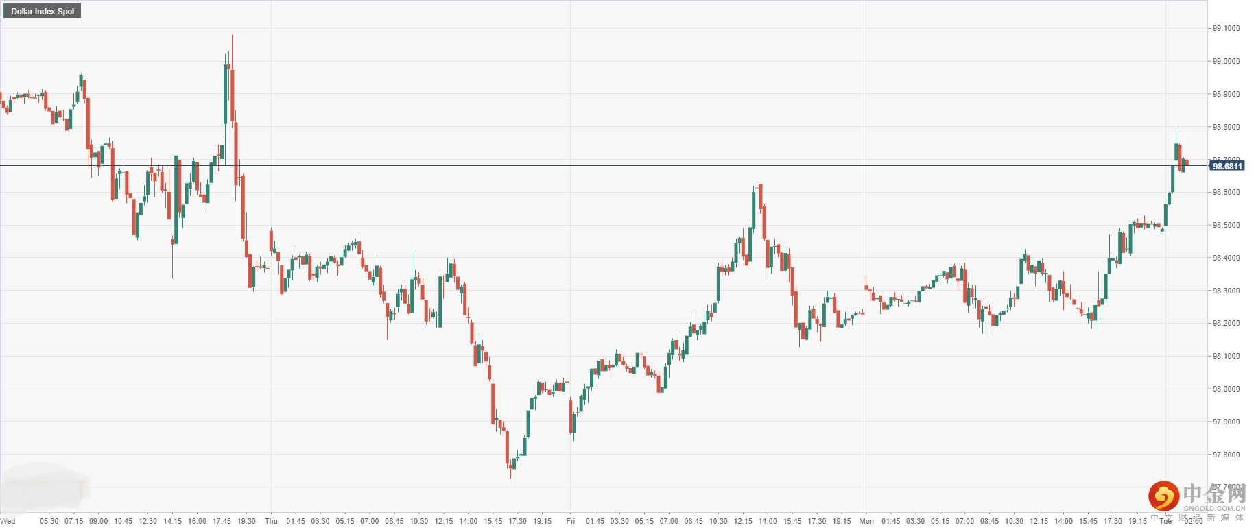 美元指数周一收盘大幅上涨后,今日开盘上升0.3%至98.68附近,由于美联储鲍威尔表示尽快采取加息行动后,美元获得上行提振。