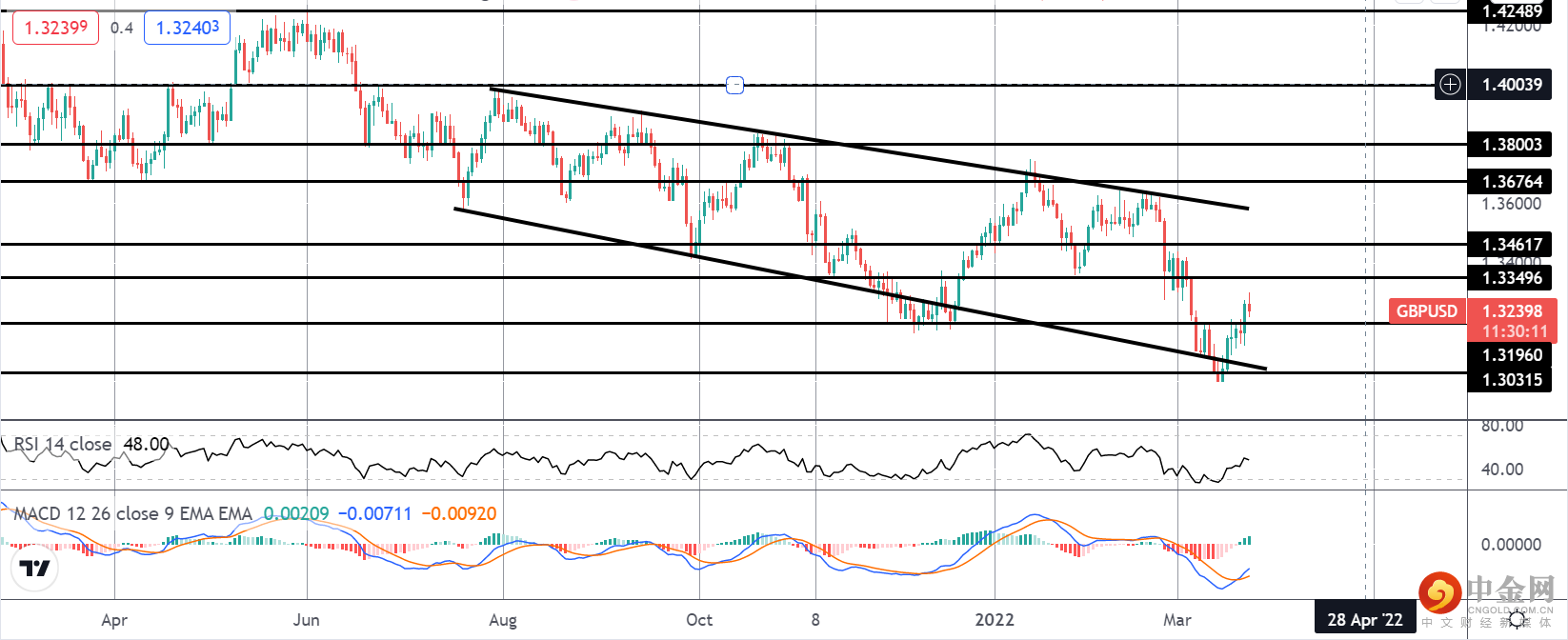 英镑兑美元从 1.3031 低点反弹,市场交易回到看跌通道的中间。价格目前维持在 1.3349 下方。然而,MACD 和 RSI 均走高,有进一步修正走高的空间,而 1.3196 为支撑。上行方面,1.3461 是下一个需要注意的上行标记,位于通道顶部之前。