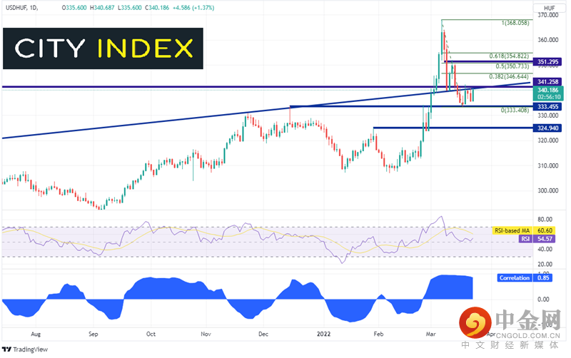 高企油价与对战争的关切提升了通胀,促使匈牙利央行周二加息100个基点,至4.4%,幅度创下2008年以来之最。但此举对匈牙利福林的影响甚微。美元/匈牙利福林与油价之间存在高度正相关联系,前者在过去一个月一直受到后者的驱动。两者目前的相关系数为+0.85。相关系数高于+0.80,视为强关联。当俄罗斯侵入乌克兰,美元/匈牙利福林与油价一起走高,双双于3月7日创下高点,其中前者的高点在368.058。后来两者双双回撤至支撑位,其中前者在3月17日构筑短线低点333.41。但自那以后油价反弹至61.8%回档位,美元/匈牙利福林却止步于水平兼趋势线阻力。相关性衡量2种交易产品同向波动的频率,而非波动的幅度。