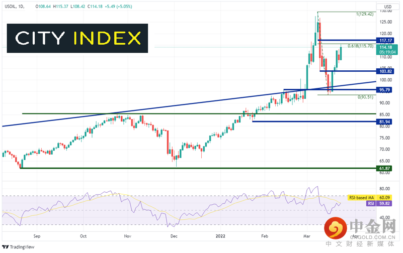 在这些媒体头条和消息作用下,西得州原油价格不断上扬,自2020年春季以来有序形成上涨通道。但到了2月28日,因俄罗斯入侵乌克兰,油价加速上涨,于3月8日创下129.42高点。油价在3月15日回撤至93.56附近支撑位,此后再度因为上述因素大举冲高。油价今天止步于115.37,其略低于3月8日高点到3月15日低点行情的61.8%回档位115.70。该低点之上为水平阻力位所在的117.17,如果攻克,有望上看近期高点129.42。支撑位在周二低点107.12,然后是水平支撑位103.82。