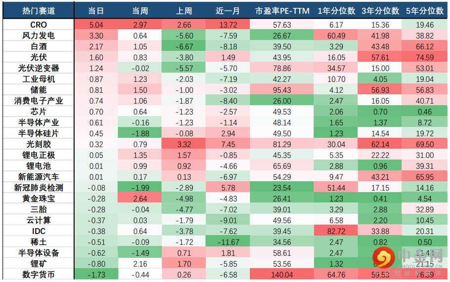 热门赛道切换频率加快;周二表现位于前列的热门赛道多数回调;其中,上一日涨幅居前的数字货币、锂矿当日分别下跌1.73%;0.80%,黄金珠宝、IDC、云计算均未能持续上涨势头;而周二回调幅度较大的CRO则反弹5.04%,领涨市场;风力发电、白酒、光伏相关板块也经历了近期的回调后出现反弹迹象。从估值角度来看,经历了几轮回调后,白酒已经跌至近一年以来的极低位置,但拉长时间段来看,仍处于3年、5年的较高估值分为数。而CRO、工业母机等赛道仍然处于近3年、5年的较低估值水平。