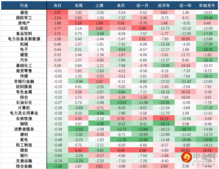 行业方面,当日涨幅前三的中信一级行业为:通信(2.67%)、国防军工(2.24%)、房地产(1.88%);跌幅位居前三位的行业为:综合金融(1.38%)、交通运输(0.74%)、银行(0.65%)。