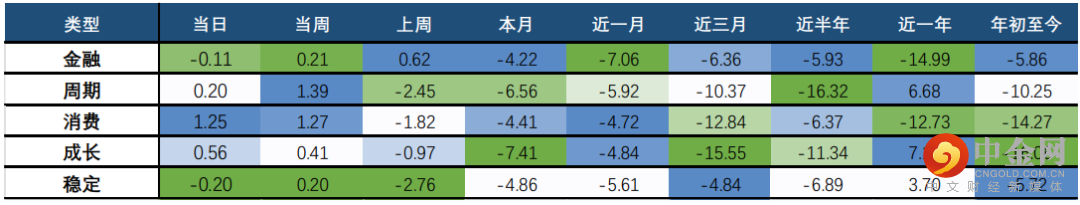 中信风格方面,金融、稳定风格回调,消费风格领涨;当日风格再次切换,金融风格未能持续上涨势头,小幅下跌0.11%;而上一交易日回调的消费、成长风格则出现不同程度反弹;其中,消费风格上涨1.25%。