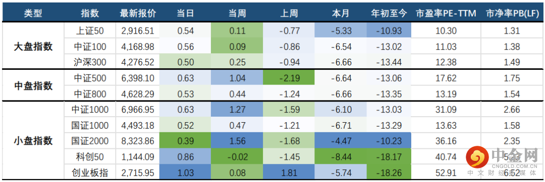 大、中、小盘指数方面,各指数均有不同程度的上涨;其中,创业板指领涨,当日上涨超1%,收于2,715.95点;而今年以来表现较优的国证2000则表现平平,上涨0.39%,收于8,323.86点;所有大盘指数涨幅均超0.50%。