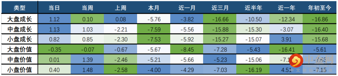 巨潮风格方面,成长、价值再次反转;当日,成长表现优于价值;其中中盘成长、大盘成长涨幅均超1%;而大盘价值则下跌0.35%,不及大市表现。整体上来看,本周价值、成长风格来回切换,市场整体上呈缩量调整状态,风格切换频繁。