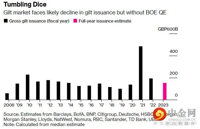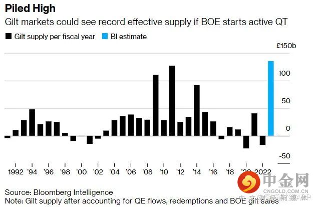 Bloomberg Intelligence估计,若总发行量为1900亿英镑,加上10月份以来每月50亿英镑的金边债券销售,市场供应将达到创纪录水平。即使英国央行没有启动QT,加拿大皇家银行资本市场估计,金边债券的有效净供应量也将达到2013-2014年以来的最高水平。