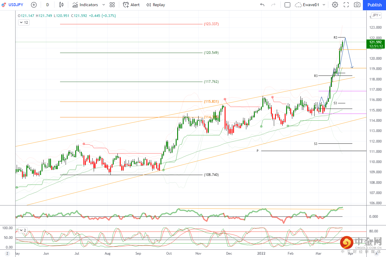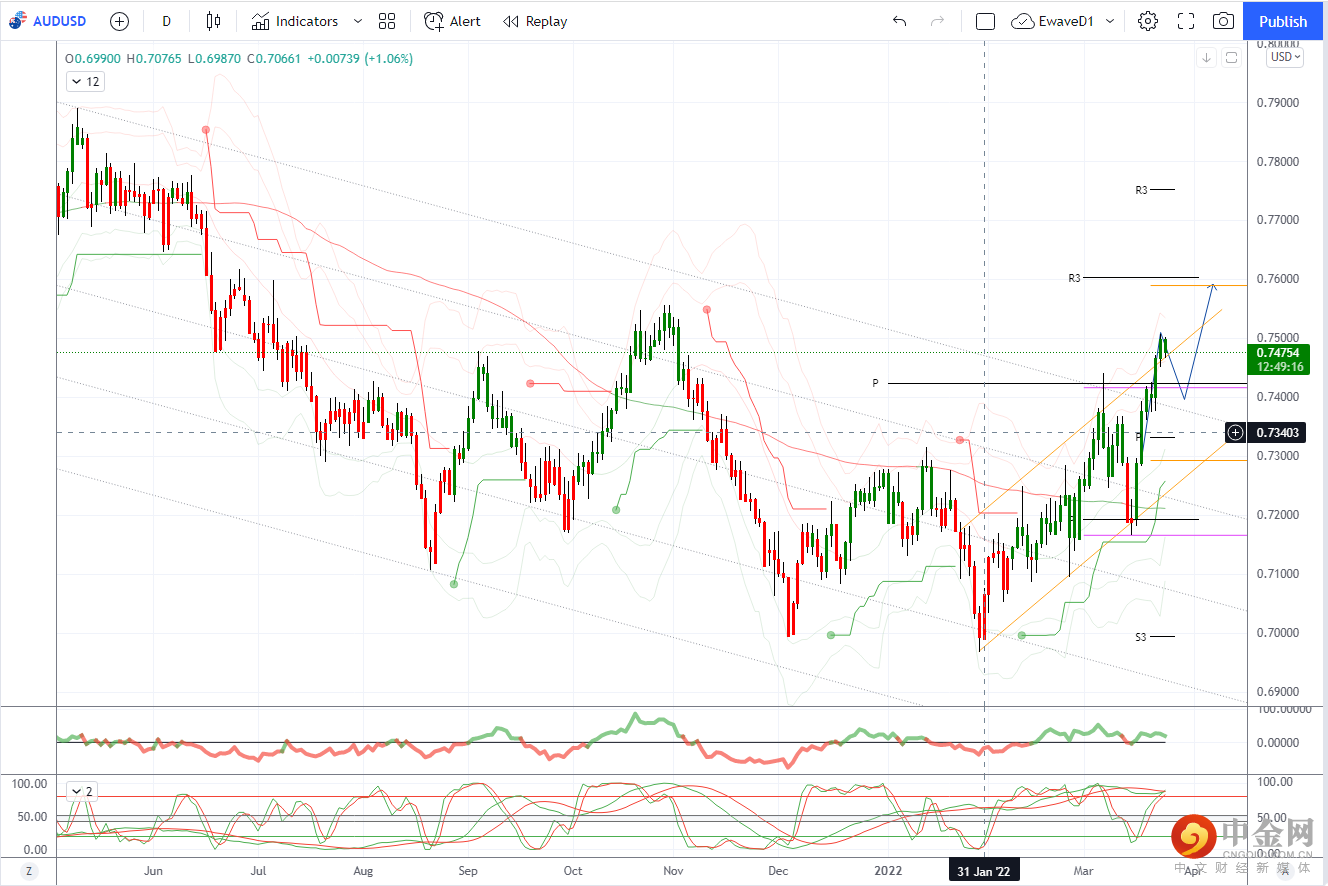 澳元/美元和澳元/日元处于超买状态,但均处于走高趋势中