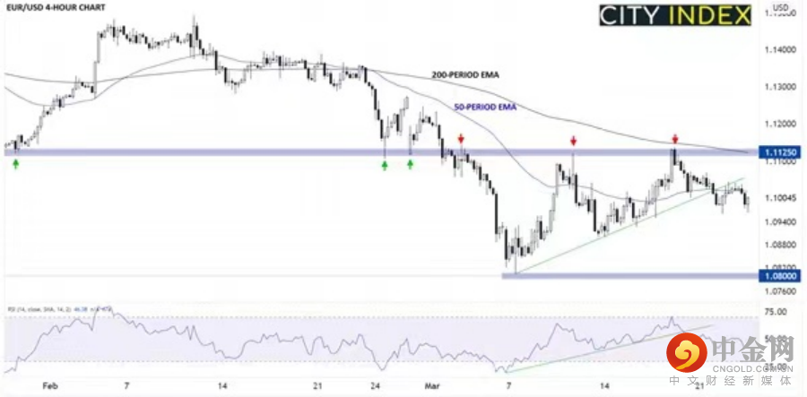 展望后市,4小时图50和200期指数移动均线正在下跌,表明中线继续趋于下行。目前支持未来几周回踩1.0800,在美联储给出明显更加积极的年内加息计划的背景下这种倾向尤其明显。