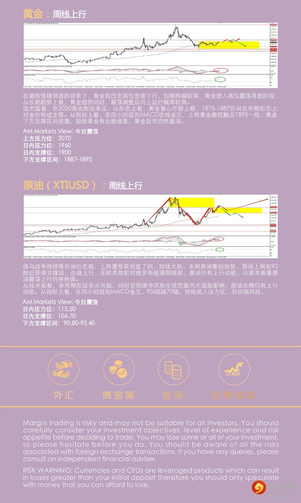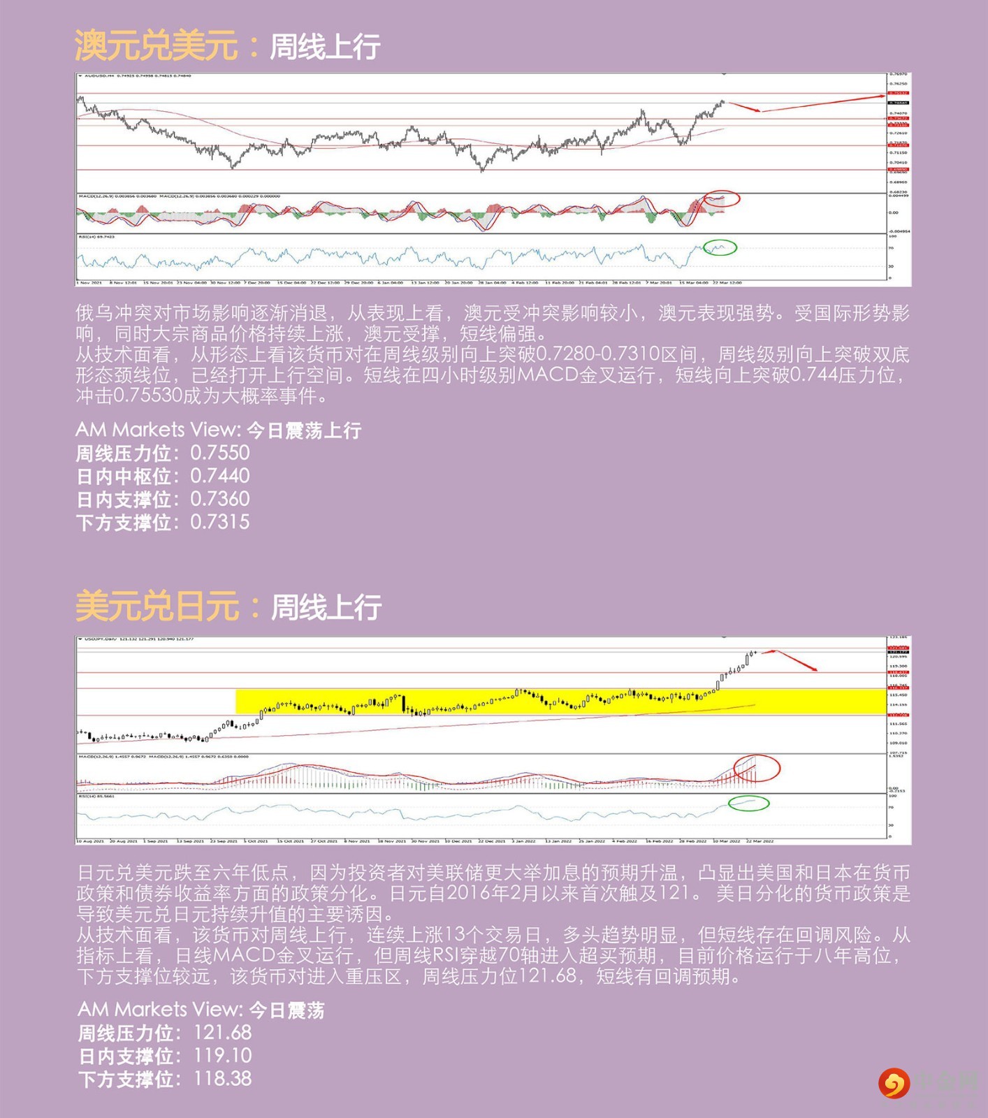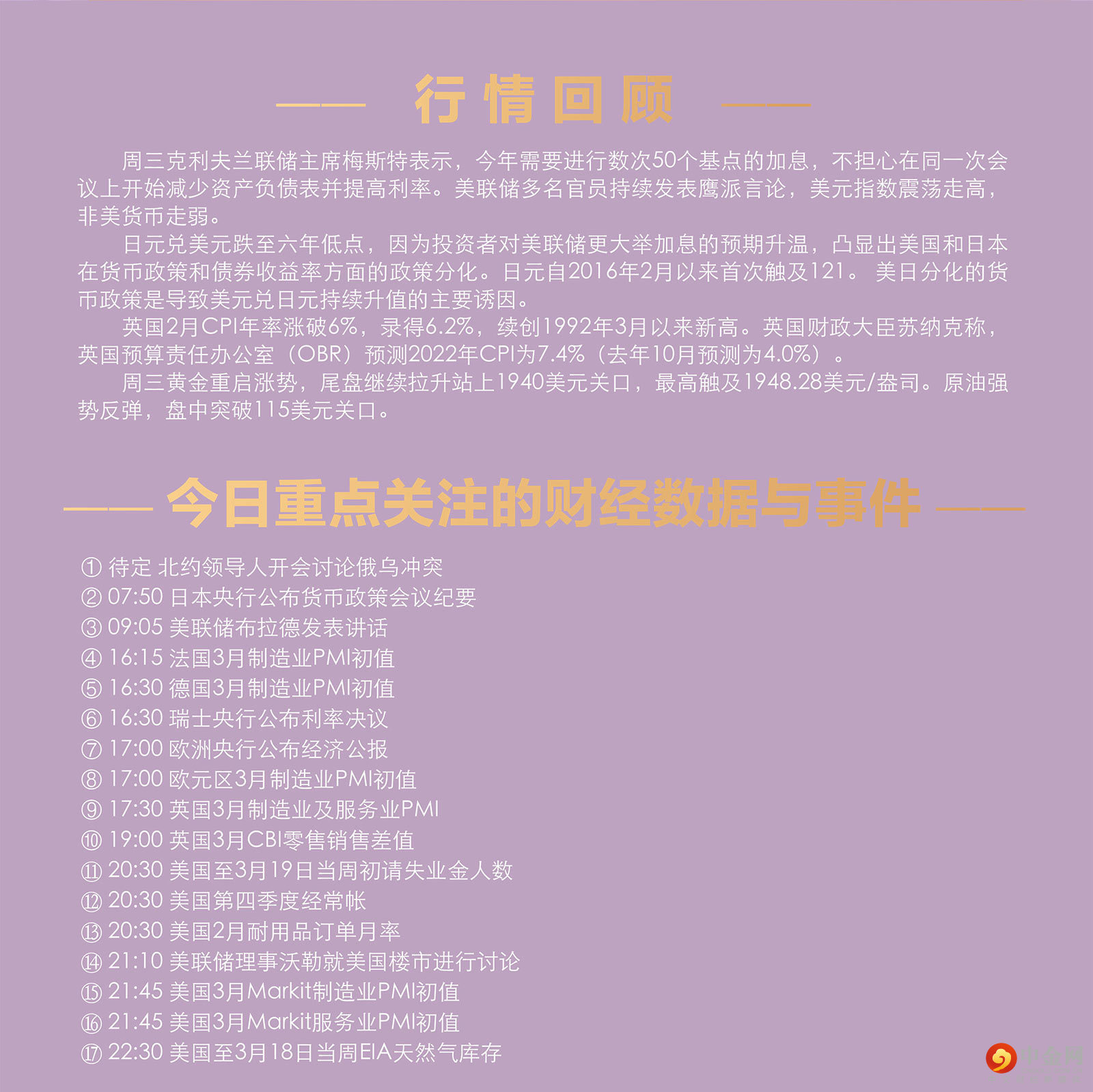 周三克利夫兰联储主席梅斯特表示,今年需要进行数次50个基点的加息,不担心在同一次会议上开始减少资产负债表并提高利率。美联储多名官员持续发表鹰派言论,美元指数震荡走高,非美货币走弱。 日元兑美元跌至六年低点,因为投资者对美联储更大举加息的预期升温,凸显出美国和日本在货币政策和债券收益率方面的政策分化。日元自2016年2月以来首次触及121。 美日分化的货币政策是导致美元兑日元持续升值的主要诱因。 英国2月CPI年率涨破6%,录得6.2%,续创1992年3月以来新高。英国财政大臣苏纳克称,英国预算责任办公室(OBR)预测2022年CPI为7.4%(去年10月预测为4.0%)。 周三黄金重启涨势,尾盘继续拉升站上1940美元关口,最高触及1948.28美元/盎司。原油强势反弹,盘中突破115美元关口。