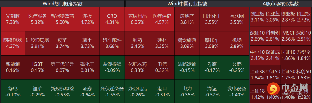盘面上,地产板块、家居板块大爆发,建材板块受提振;光刻胶领涨概念板块;医疗保健、制药板块强势上扬,新冠特效药概念火热;餐饮旅游等消费股回暖;网络游戏概念大涨。锂电板块回调,港口、海运板块跌幅居前。