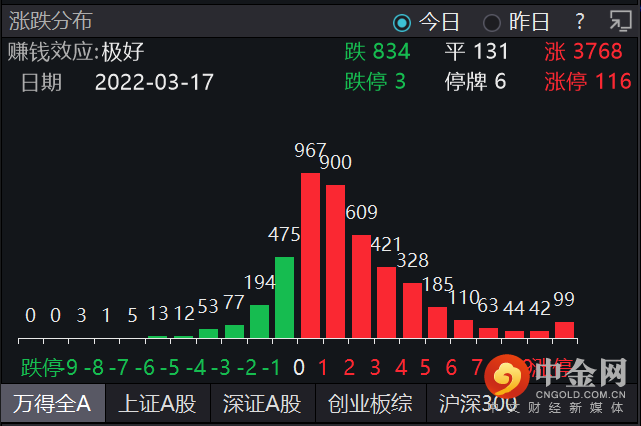 个股涨多跌少,赚钱效应极好。Wind数据显示,沪深两市共上涨3768只,下跌834只,其中,涨停个股116只,跌停个股3只。