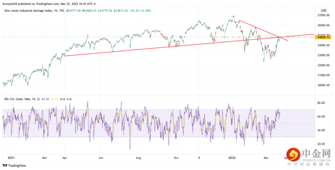 道琼斯工业平均指数今天刚好重返34800点的阻力线处并停滞。这是道琼斯工业平均指数的一个关键点位。若道琼斯工业平均指数突破该点位,则会再反弹1000点。若无法突破,则会再探此前的低点们。