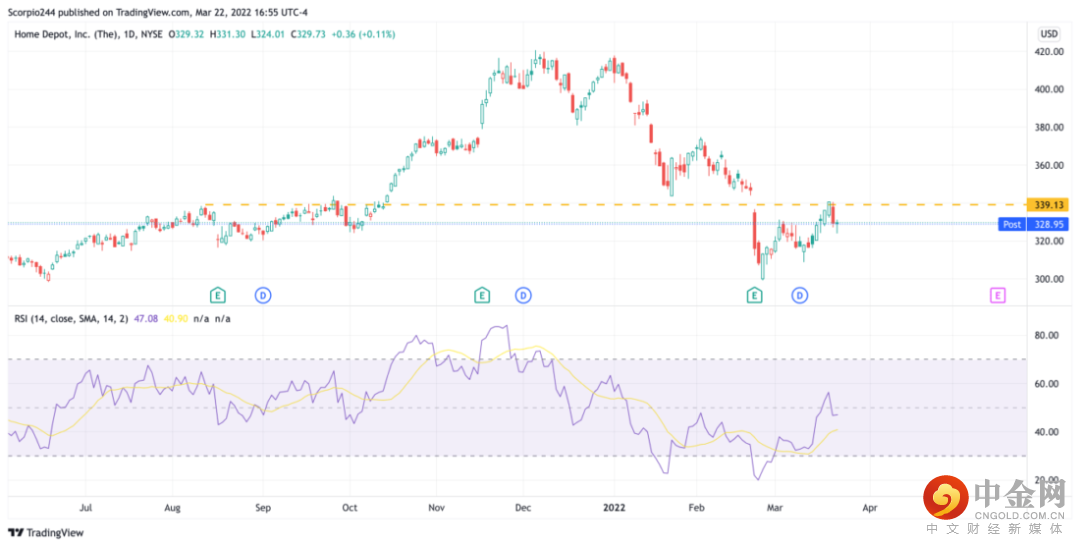 家得宝的图表中有着同样的情况,如果这是对未来走势的一个领先指标,则意味着阻力线牢牢地维系着。