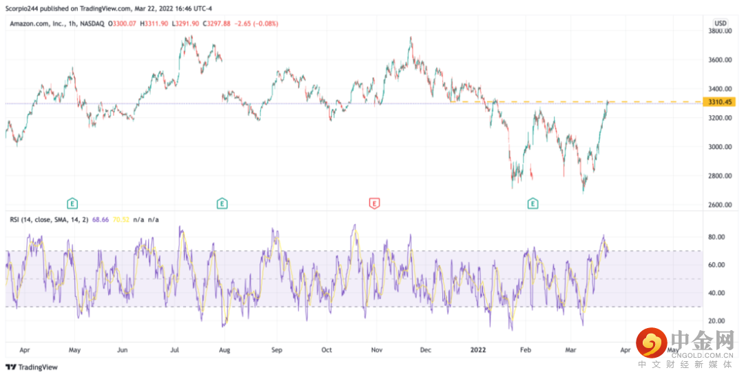 我在周日指出亚马逊必须突破3250之3300美元的阻力区间。今天亚马逊在3310美元处止步,刚好在这一区间。