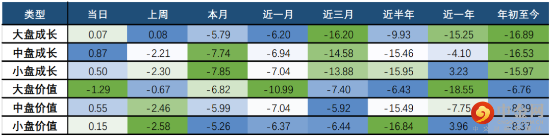 巨潮风格方面,大盘价值跌幅居首位,当日下跌1.29%;而各市值成长风格表现略强于价值风格,延续上周成长优于价值风格的行情。
