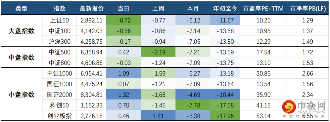 大、中、小盘指数呈现大、小盘分化行情,小盘指数表现明显强于大盘指数;其中,国证2000领涨,当日上涨1.32%,收于8,304.81点;中证1000、双创均收涨;而大盘指数方面,各大盘指数均收跌;其中,上证50下跌0.72%,报2,892.11点。