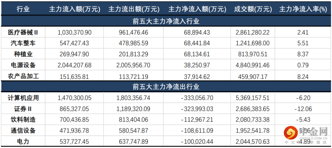 主力资金方面,当日沪深两市主力资金净流出130.48亿元;其中,医疗器械、汽车整车、种植业位列主力资金净流入前列,分别获净流入6.89亿元、6.84亿元、6.81亿元;计算机应用、证券、饮料制造则遭净流出33.31亿元、32.40亿元、11.30亿元。