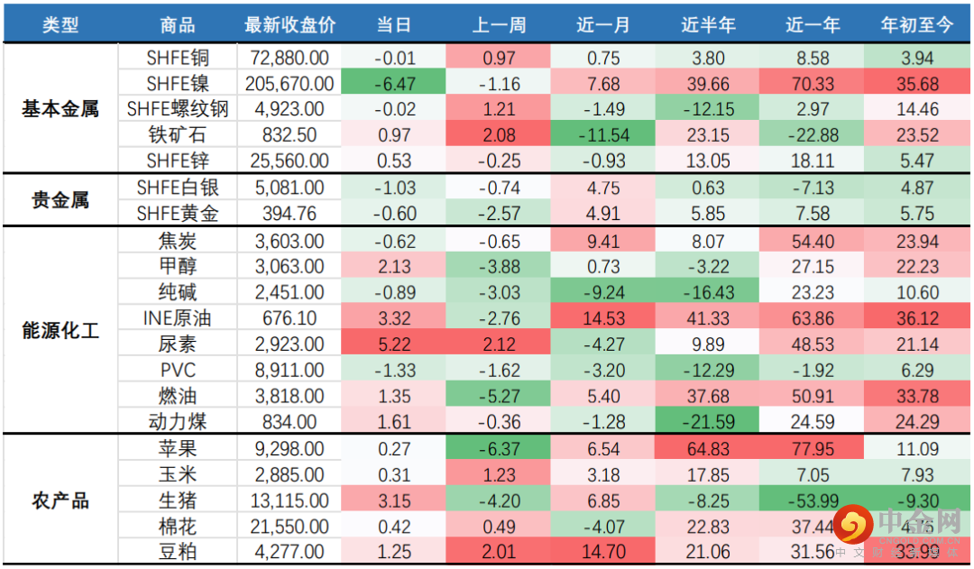国内商品期货市场收盘多数收涨;能源化工涨幅居前;其中,尿素领涨,当日收涨超5%;低硫燃料油涨超4%,原油涨近3%;基本金属方面,沪镍跌超6%,其他基本金属多数上涨;农产品方面,生猪呈现反弹行情,当日上涨3%。