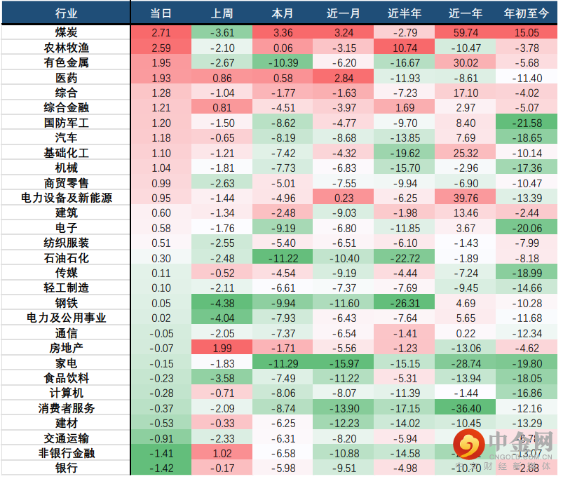 行业方面,当日涨幅前三的中信一级行业为:煤炭(2.71%)、农林牧渔(2.59%)、有色金属(1.95%);跌幅前三的行业为:银行(1.42%)、非银行金融(1.41%)、交通运输(0.91%)。