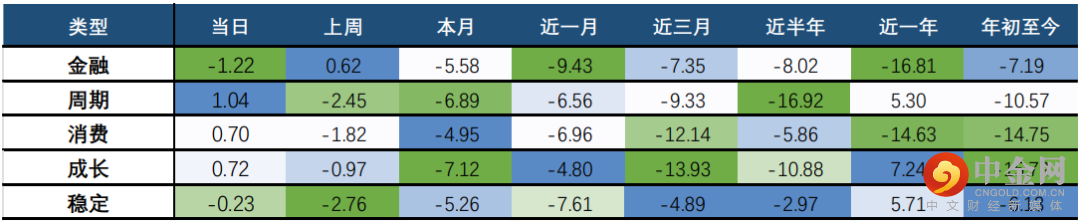 中信风格方面,金融风格在上周收涨的情况下有所回调,当日下跌1.22%;而周期板块表现相对强势,当日收涨1.04%;