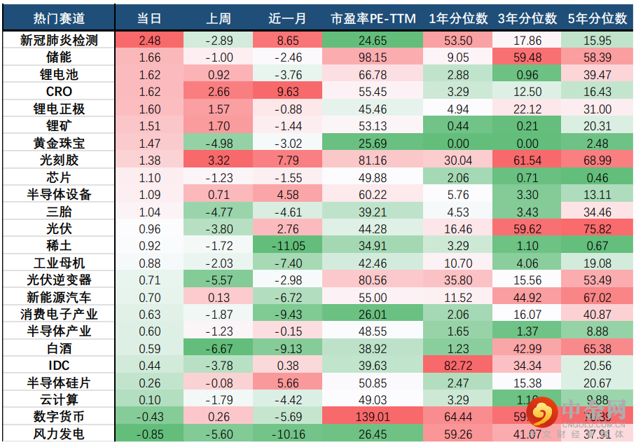 热门赛道方面,医药、新能源部分赛道持续上周强势表现;新冠检测卷土重来,当日涨2.48%;CRO新能源板块中,锂电池相关板块持续上周行情,其中锂电池、锂电正极、锂矿分别上涨1.62%、1.60%、1.51%。