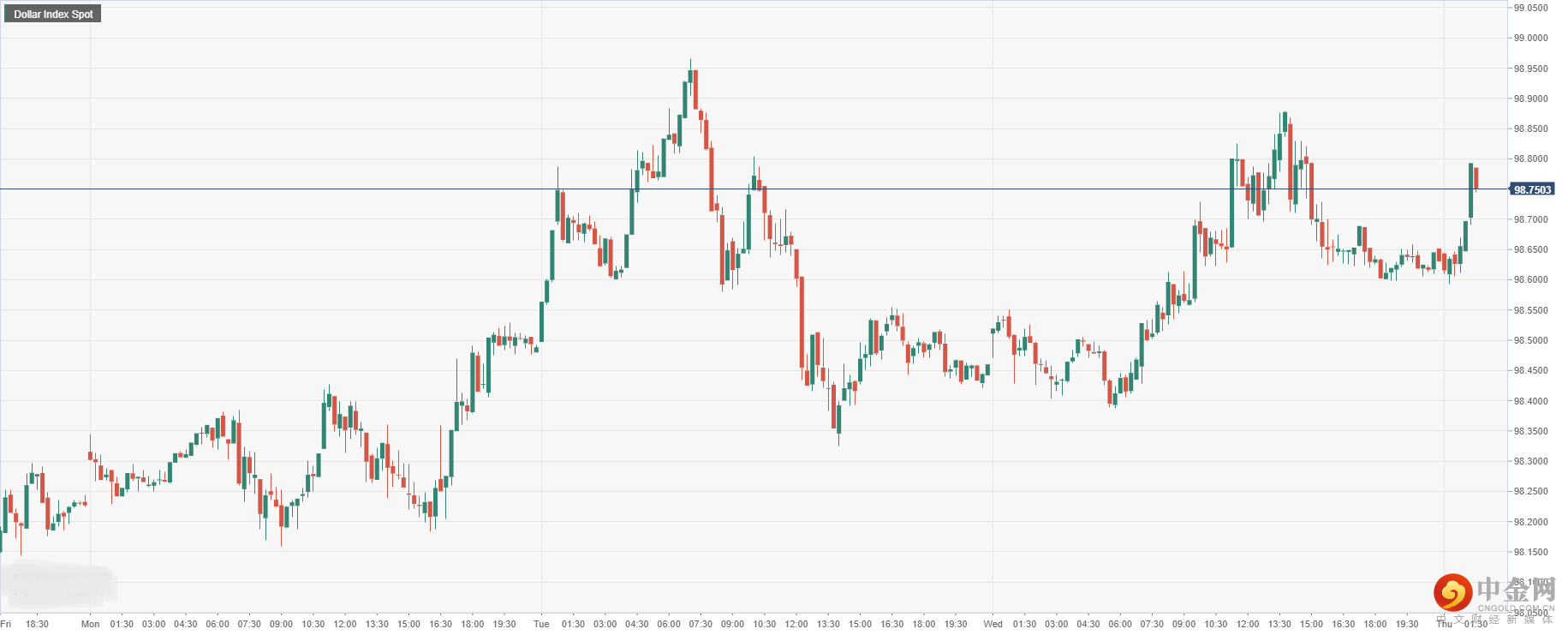 美元指数周三盘中大幅回升后,今日开盘涨0.24%至98.75附近,由于继美联储主席鲍威尔表示采取激进加息步伐后,获得其他决策者的呼应,使得美元获得上行支撑。