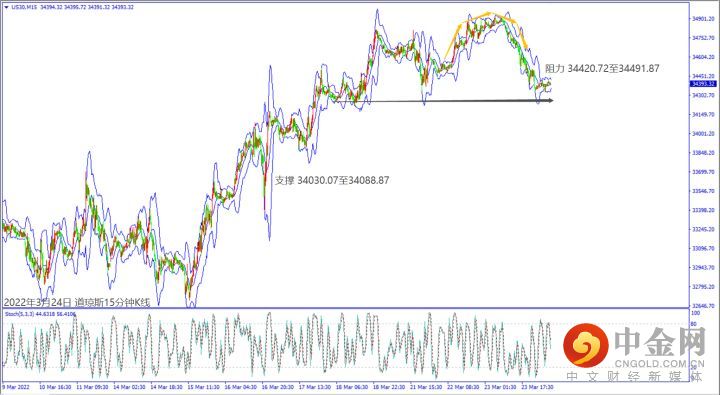 昨天(23日)市场担忧俄乌战争冲击欧洲经济,以及美联储官员称今年需要进行数次50个基点的加息利淡美股,造成欧美股指一路下跌近2%。预期今天(24日)欧元区公布制造业数据不佳,德指一旦跌破10日均线14,204,建议可偏空操作。预期今天美国公布经济数据大都不佳,道琼斯冲不过小时布林带上轨线34,454,建议可短空操作。