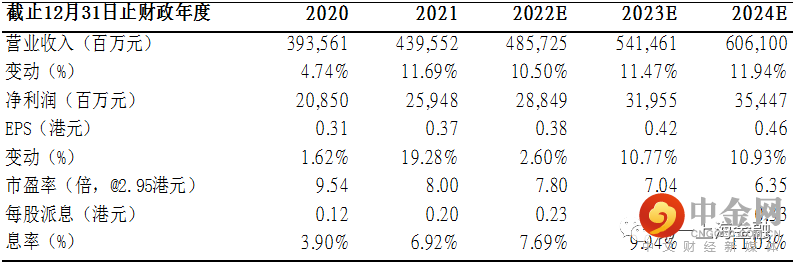 考虑到公司5G渗透率上升带来ARPU值的增长、智慧家庭业务带动的综合宽带ARPU的提升,以及公司保持产业数字化的高速增长态势,我们适当上调公司2022-2023年营业收入和净利润分别致4857亿/5416亿元(原值4685亿/5014亿元)、288亿/319亿元(287亿/295亿元),维持目标价格至 3.9港元,对应2022-2024年7.8倍/7.0倍/6.4倍市盈率,较目前价格有32%的上涨空间,买入评级。