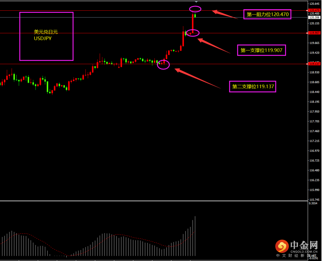 天图美日收阳线,价格继续冲高,多头相对强劲,短期虽面临调整,但上方未走出大阴线,空头力度相对较弱,日内更多以震荡以及震荡上行为主。小时图美日期间价格连创新高,MACD位于0轴之上,多头占优,短期上方无大阴线下滑,空头较弱,日内更多以震荡以及震荡上行为主?(大阴线不出,空单不入)