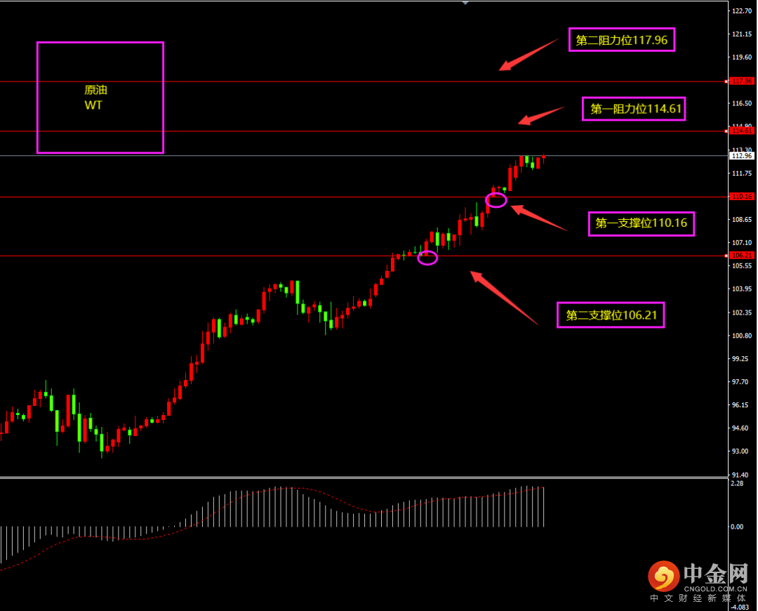 原油昨日收大阳线,价格大幅冲高,多头相对强劲,短期MACD位于0轴之上,多头为主,近日以美为首的北约成员制裁俄罗斯影响油价,日内更多以逢低看多为主?小时图原油自期间连续阳线拉升,MACD位于0轴之上,多头占优,短期无大阴线回落,空头较弱,日内更多以逢低看多为主?(大阴线不出,空单不入)