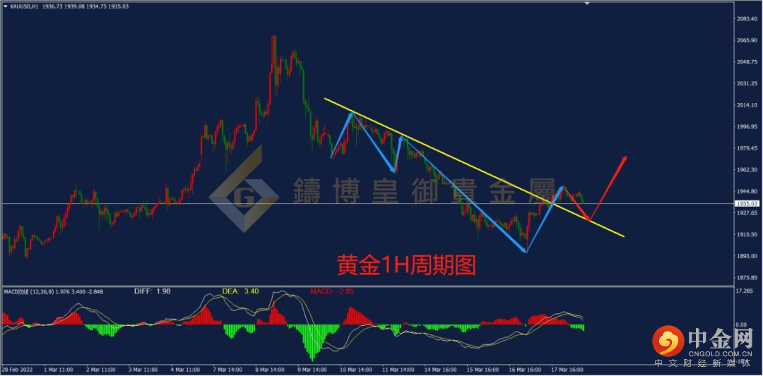 从下方的黄金1H周期图来看,黄金此前自2070一线回落后,于1H级别形成下跌趋势线,行情于趋势线下方运行。昨日,行情再次向上突破下跌趋势线,此前的1H级别下跌形态被破坏,行情或将迎来调整。从指标上来看,当前MACD指标的多头动能呈现放量形态,且DIFF与DEA双线成功上破0轴,预计行情后市大概率迎来上涨。建议日内操作以做多为主,可等待行情回踩下方趋势线确认后,于1920一线布局多单。