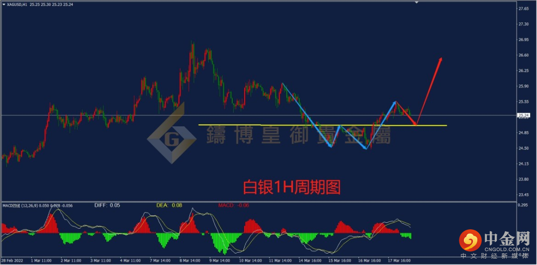 从下方的白银1H周期图来看,白银此前自高点回落后,于下方形成“W底”形态。昨日,行情向上突破颈线压力,行情成功筑底反弹。从指标上来看,当前MACD指标的多头动能呈现放量形态,且双线成功上破0轴,白银有转多迹象,预计后市大概率迎来上涨行情。建议当前操作以做多为主,可等待行情回踩颈线支撑确认后,于25.00附近布局多单。