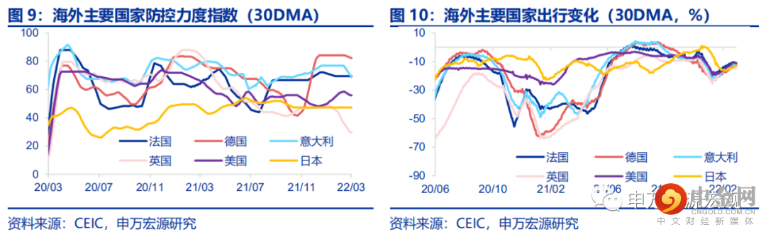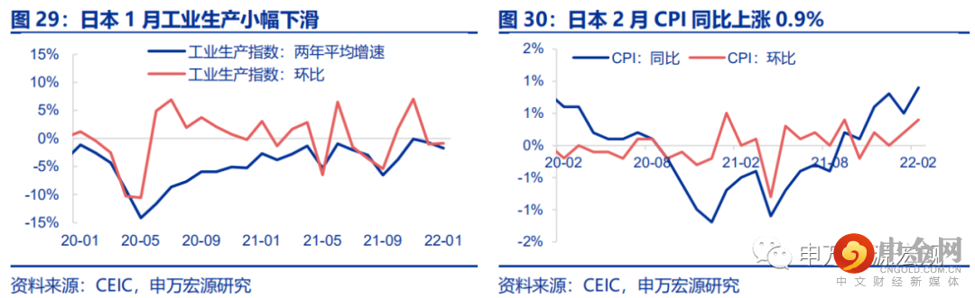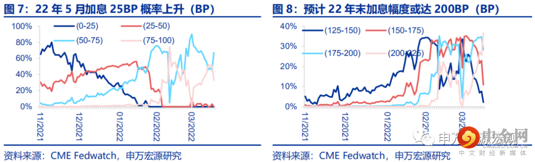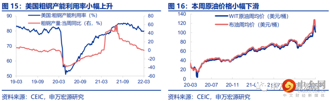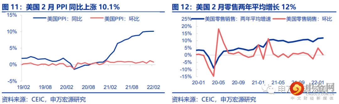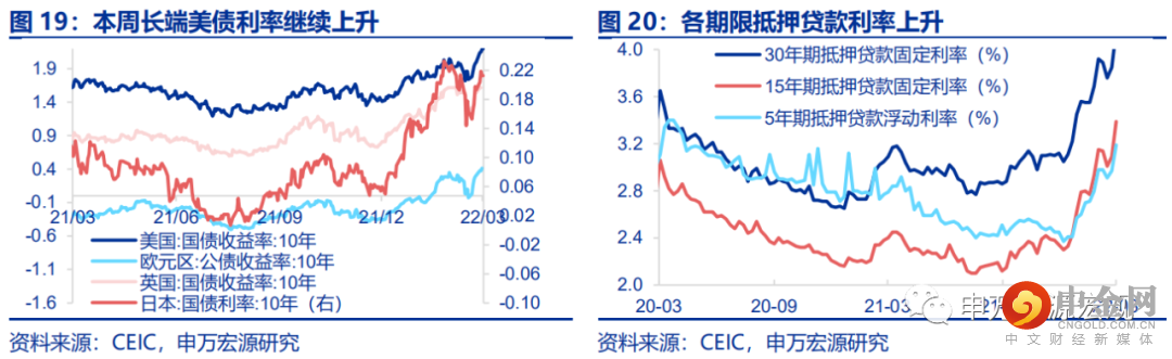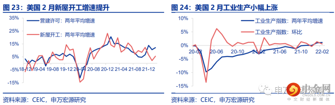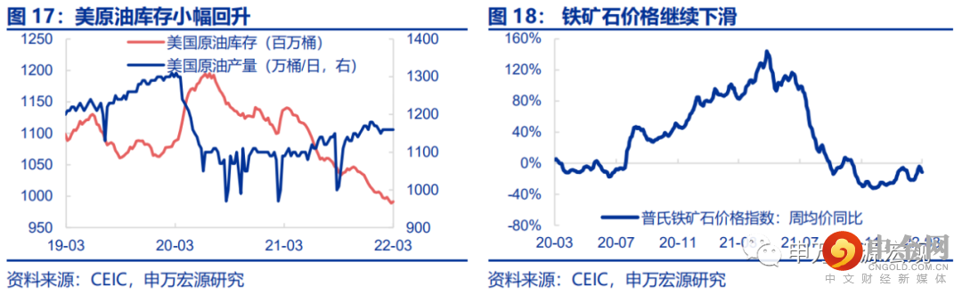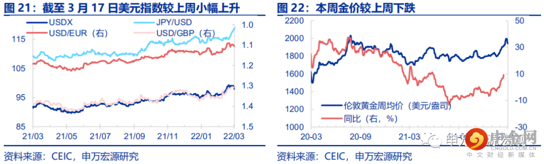 美元指数会后也走弱,主要反映美国经济前景下修,以及俄乌谈判缓和迹象出现。18日美元指数收于98.23,相对于16日亦有所下行,16-18日美元相对欧元、英镑分别贬值0.1%、0.2%,美德短端利差同期亦有所收窄,一方面体现美国经济前景下修,另一方面体现本周下半段俄欧谈判出现进展,使得市场对于欧洲经济悲观情绪有所修复。综合美债利率、美元指数来说,尽管俄乌危机对资产价格造成较大冲击,但两者相较于去年末(美元指数:95.67、10Y美债利率:1.52%)仍然处于高位,预计缩表落地前美债利率和美元指数还分别将上行至2.2-2.5%、99-100左右。而缩表于6月前后启动的概率正在提升,从而美债利率、美元指数见顶的预计时点可能比前期预期小幅提前一个月左右。