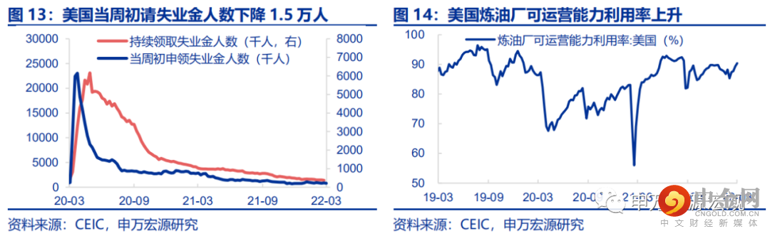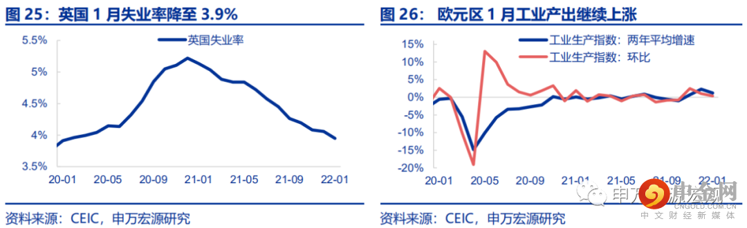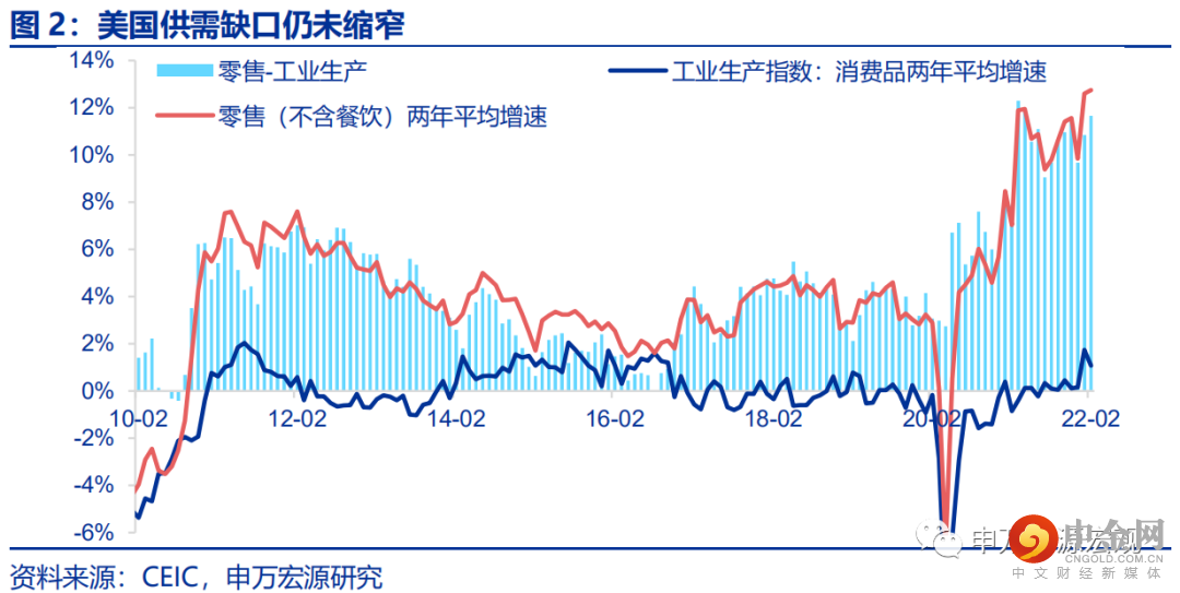 美国供需两端数据显示消费品供需缺口仍未缩窄,这背后正是因为美国是发达经济体中唯一呈现明显薪资通胀螺旋的国家,导致其滞胀局面可能持续时间较其他发达国家更久,从而所需加息次数更多、缩表力度更大。本周公布的2月美国零售两年平均增速提升至11.9%,较上月继续有所提升。距离去年9月大部分财政退出已经接近半年之久,但近期美国居民需求增速虽有反复,整体趋势仍然远远强于疫情之前,这背后的推动力实际上来自于美国居民薪资议价能力的提升,与本月非农居民时薪两年平均增速仍处高位相对应。而且,薪资议价水平畸高的另一面是低迷的就业意愿,所以2月美国工业生产两年平均增速仅向上改善0.1个百分点至1.1%,相对于居民零售之间的鸿沟并没有缩小,从而能够解释美国耐用品通胀仍然剧烈。